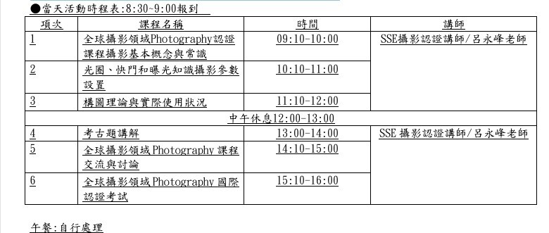活動日期:7/10(週四);上午9:00~16:00 攝影基本素養與科技數位進化暨全球攝影領域Photography認證