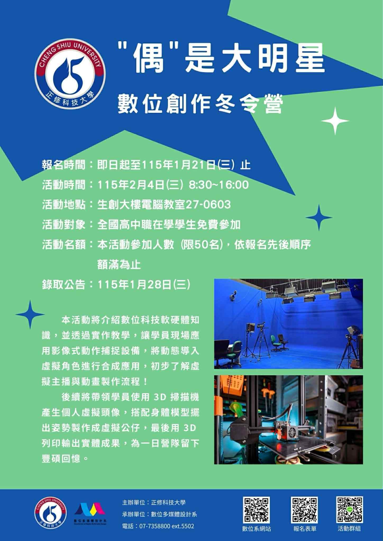 活動內容:認識數位科技軟硬體的相關知識,並以實作教學的方式,現場指導創作自己心目中的虛擬主播角色,並應用影像式動作捕捉設備將動態資料導入,在虛擬場景或實景中進行合成應用,讓學生對虛擬主播與動畫的製作流程有初步的基礎,接著帶領學生與自己創作的虛擬主播以最撫媚的姿態合照,為一日的營隊活動中留下最豐碩的成果。