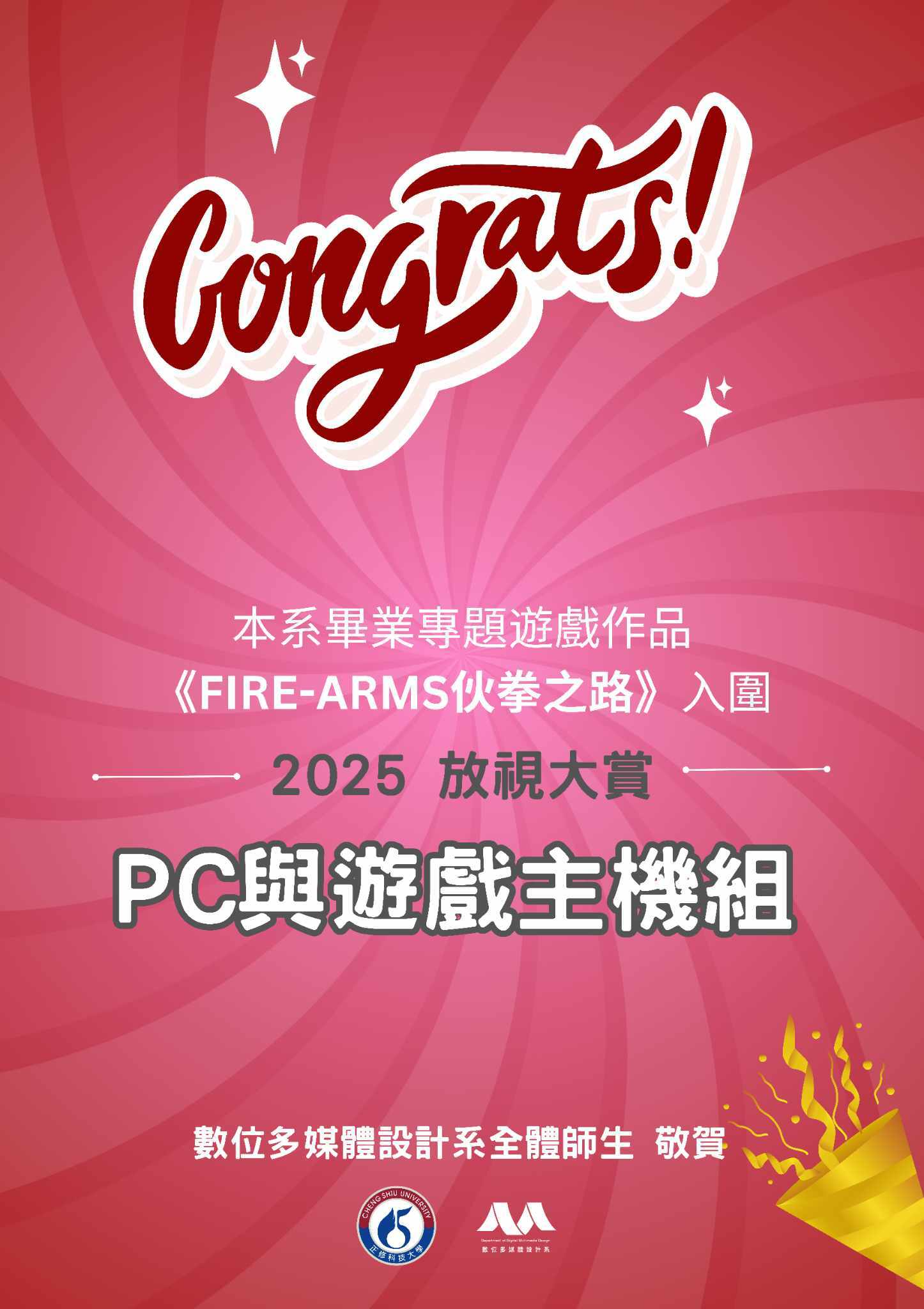 本系114級畢業專題作品「FIRE-ARMS伙拳之路」入圍2025放視大賞1項(PC與遊戲主機)獎項!